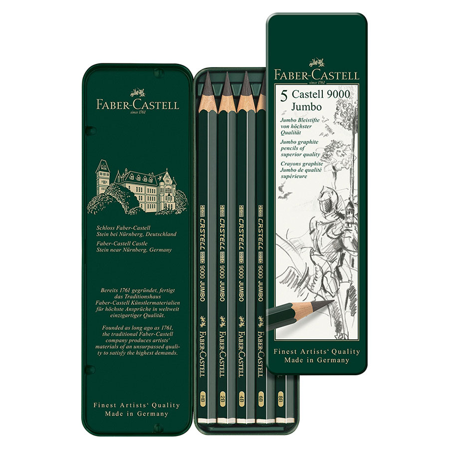 Lápiz para artistas Castell 9000 Jumbo, Estuche de metal con 5 lápices, HB, 2B, 4B, 6B, 8B