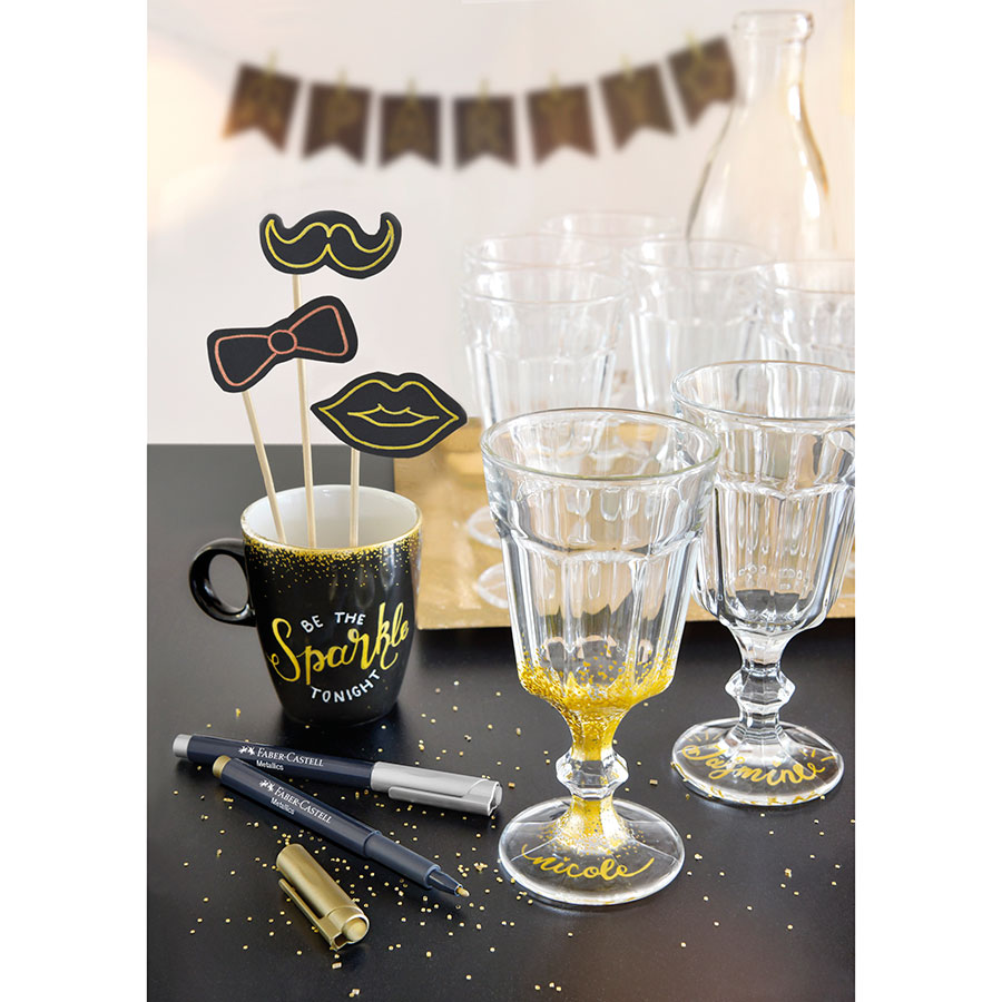 Ideal for most surfaces (paper, cardboard, glass, plastic, metal, stone); Smudge- and splash-proof; After fixation in the oven at 160°C the ink is waterproof (not dishwasher-proof); Noble metallic effect; Water-based ink; Does not bleed through the paper; Odourless; No pumping or shaking needed; 1.5 mm felt-tip pen; Colour heart of gold