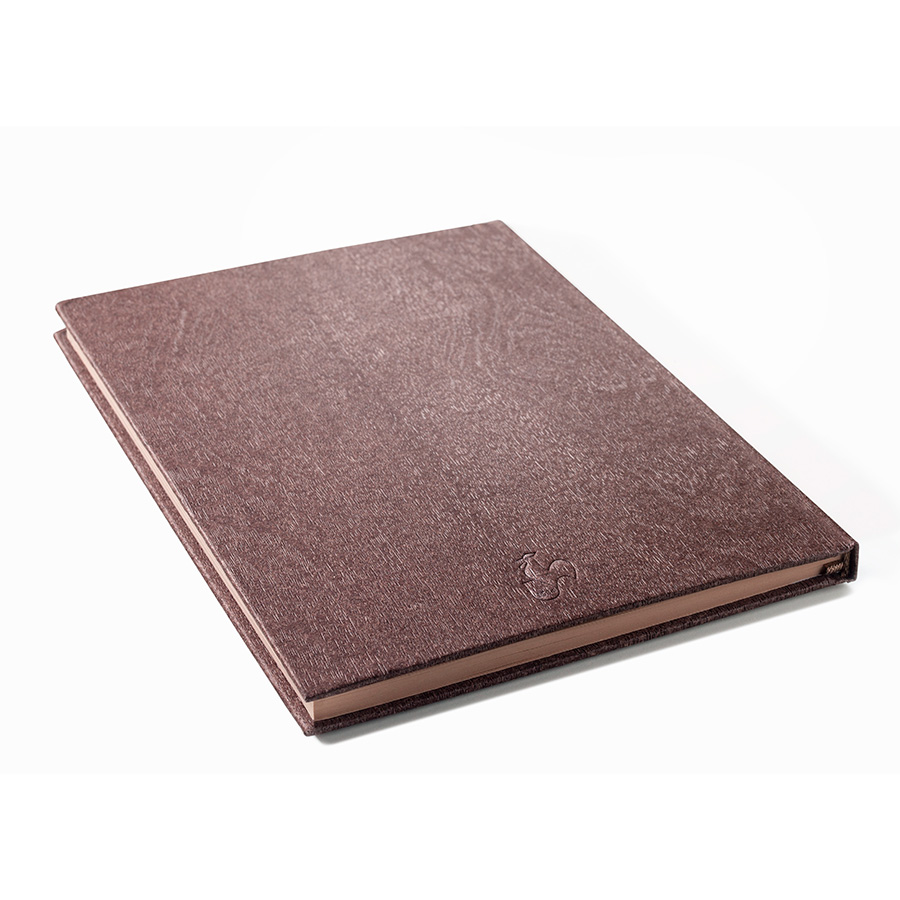 La tapa del cuaderno es de color marrón oscuro y tiene un tacto delicado que recuerda a la madera noble. La encuadernación cosida con hilo permite dibujar por encima del pliegue central. Un marcador de cinta marrón y el logotipo del gallo estampado en la tapa trasera completan la composición de este cuaderno.