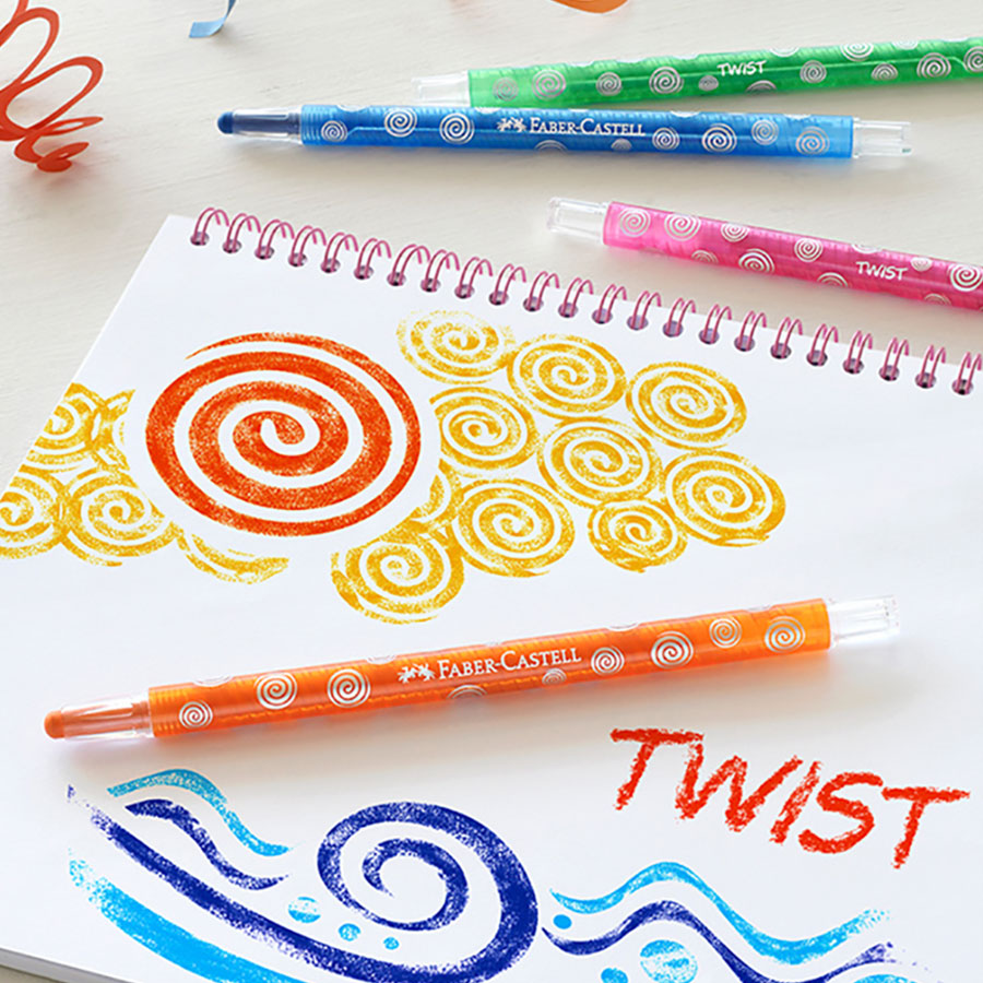 Crayones de ceras acuarelables giratorias para divertirse coloreando; Colores con trazo suave e intenso; Con práctico mango de plástico; Limpio, seguro y fácil de usar; Práctico giro en lugar de empujar; No necesitan sacapuntas; Caja de cartón de 24 unidades