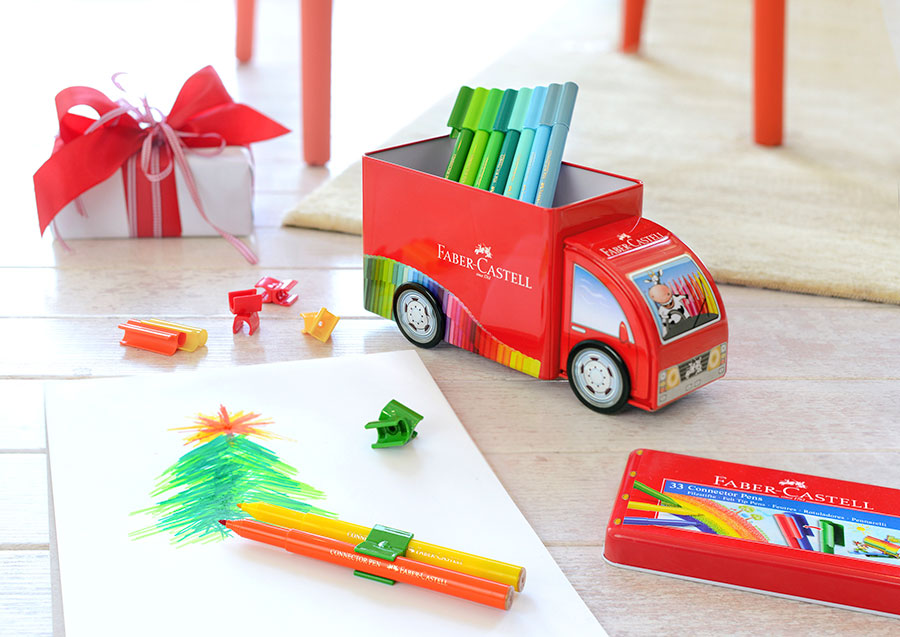 El rotulador para pintar, crear y jugar; Juego de rotuladores Connector Camión; Contenido: 33 rotuladores Connector en diferentes colores, 10 pinzas Connector; El capuchón especial permite enganchar los rotuladores unos con otros; Colores brillantes; Clips de sujeción giratorios para crear y jugar; Lavable en la mayoría de los tejidos; Los rotuladores animan a utilizar técnicas diferentes para alcanzar una creatividad sin límites; Embalaje de alta calidad reutilizable