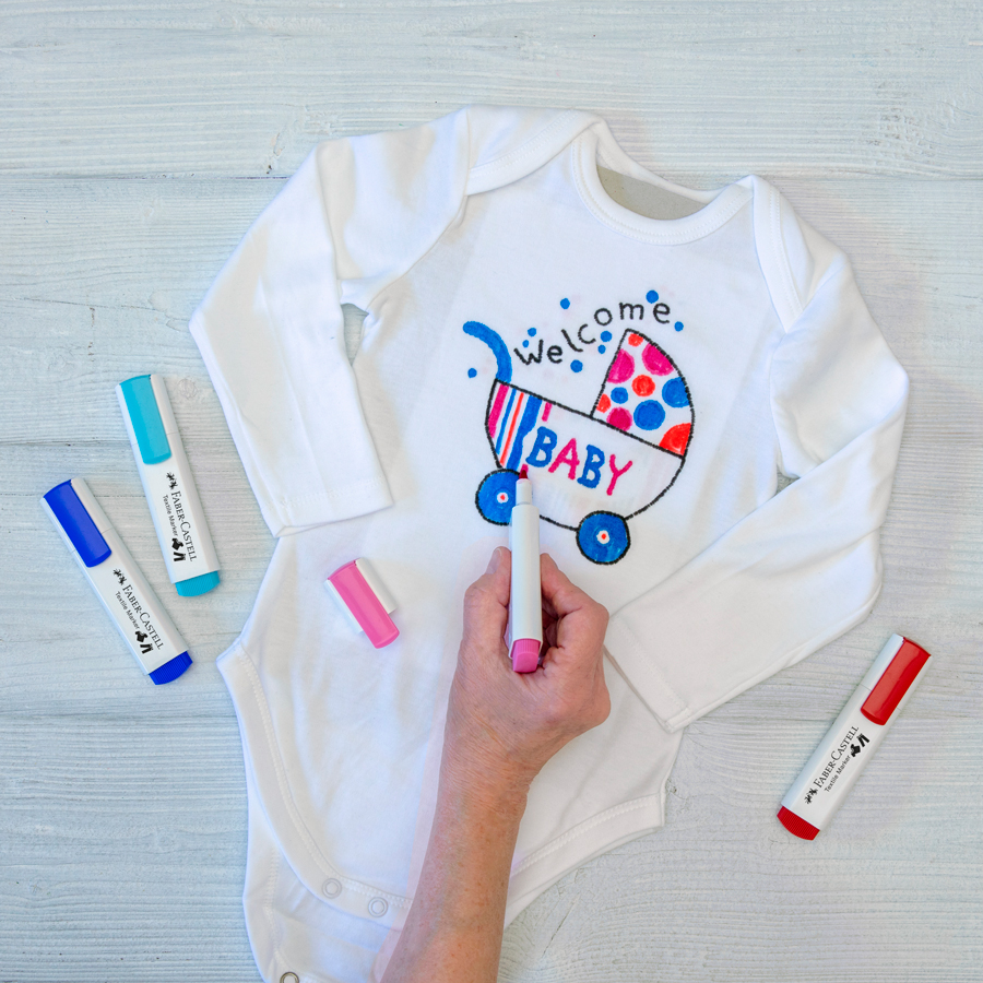 Perfecto para tu próxima fiesta baby-shower; Marcador textil en rojo, rosa claro, azul y azul claro para colorear y personalizar tus prendas o las de lo peques; Junto con el negro, ideal para contornos y nombres; Se fija automáticamente después de 24 horas o inmediatamente después de planchar; Adecuado para una amplia gama de telas; Color rápido y lavable hasta 40 ° C o 60 ° C para algodón; Consejo: se deben lavar máscaras o telas de algodón nuevas antes de pintar para mejorar la absorción de tinta; 3 anchos de línea en un solo marcador: 1 mm, 2 mm y 5 mm; Cuerpo y capuchones de 100% plástico reciclado