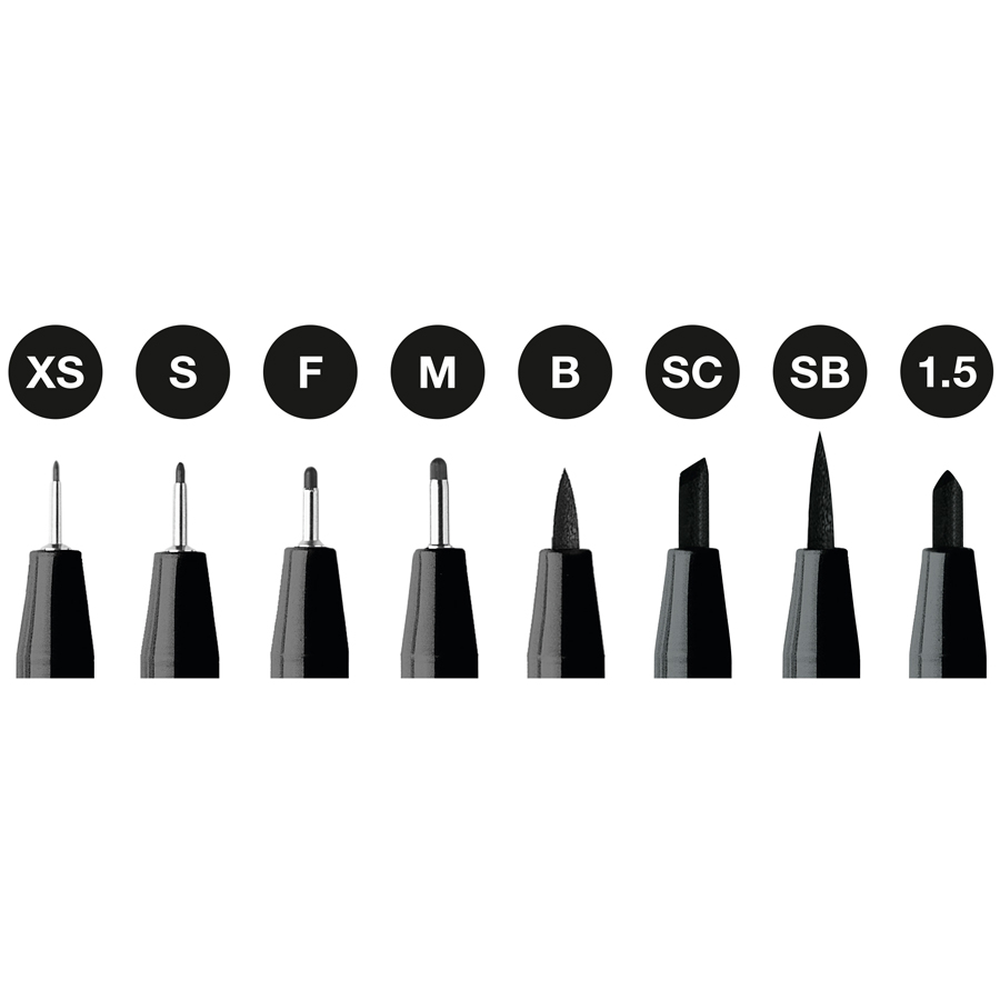 Estuche con 6 unidades; Incluye: XS = 0,1 mm, S = 0,3 mm, F = 0,5 mm, M = 0,7 mm, B = punta de pincel, 1,5 = punta redonda 1,5 mm, SB = punta de pincel suave, SC = punta de cuña suave; Color 199 negro