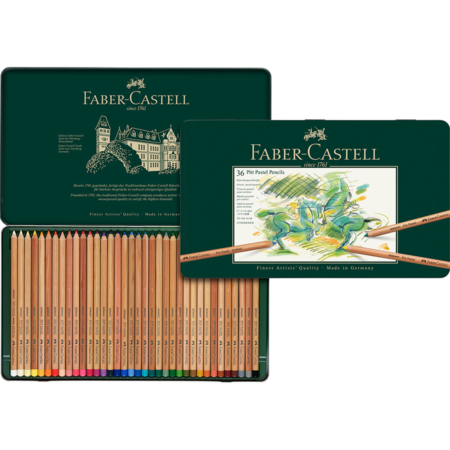 Lápiz pastel para artistas; Pigmentos de alta calidad con resistencia a la acción de la luz y luminosidad de color insuperables; Trazo de colorido intenso; Se borra muy bien. Mina de 4,3 mm de grosor; El color se mantiene con fijadores; Estuche de metal con 36 colores.