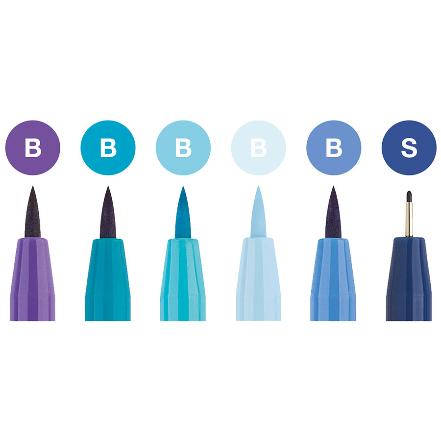 Tinta pigmentada; Máxima resistencia a la acción de la luz; Resistente al agua, permanente; Inodora, sin ácidos, pH neutro; No atraviesa el papel; 6 lápices de tinta en estuche; Puntas S = 0,3 mm color 247 azul de idantrona, B = punta de pincel colores 120 ultramarino, 136 violeta púrpura, 148 azul hielo, 153 turquesa cobalto, 154 turquesa cobalto claro; Ideal para dibujo creativo de letras (lettering) y caligrafía artística